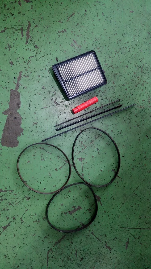 今回は12ヵ月点検を毎年受けていただいている車両でしたので、特にお金のかかる修理もなくファンベルト・クーラーベルト・パワステベルト・エアクリーナーエレメント・ワイパーゴム・発煙筒・エンジンオイル・オイルエレメントの交換で車検完了しました。